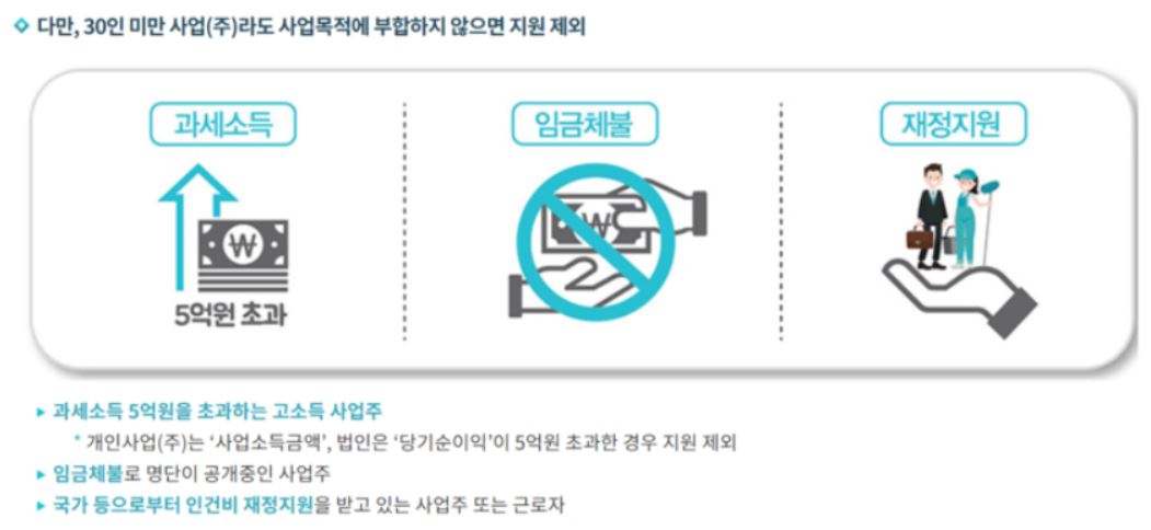 일자리 안정자금 지원대상의 경우에는 원래 원칙적으로는 30인 미만의 사업장 사업주에게만 지원이 되는 제도입니다. 그러나 일자리 안정자금 지원대상은 과세소득이 3억원 이상의 고소득 사업장의 사업주나 임금체불 공개 사업주 그리고 최저임금을 지키지 않은 사업장, 국가로부터 인건비를 지원받는 사업장은 제외 됨을 참고해야합니다.
