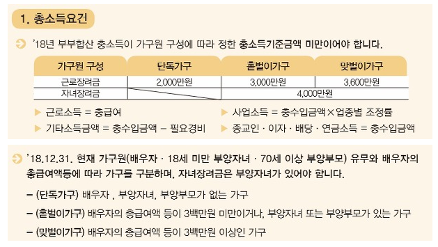 2020 근로장려금 신청자격은 단독가구는 배우자와 부양자녀 그리고 부양부모가 없는 경우를 말합니다. 그리고 홑벌이 가구의 경우는 배우자 총 급여액이 300만원 미만인 가구를 말하는데, 18세 미만의 부양자녀와 70세 이상의 부양하는 부,모가 있는 것을 말합니다.