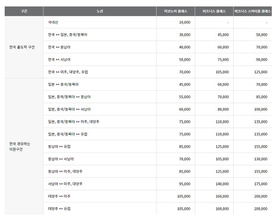 또한 가장 먼 거리의 미주나 대양주, 유럽 항공권의 경우 왕복 70,000 마일리지가 차감됩니다.