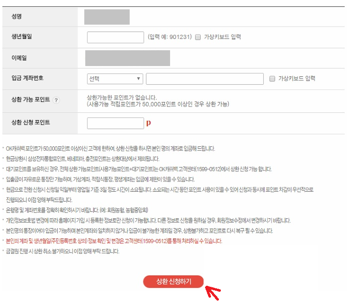 사진에서 볼 수 있듯이 간단한 개인정보와 이메일을 입력해서 ok캐쉬백 현금전환이 가능합니다. ok캐쉬백 포인트를 현금으로 전환하기 위해서는 반드시 알아두어야할 점이 있습니다. ok캐쉬백 현금상환 즉 현금전환을 위해서는 최소한 5만 포인트 이상의 ok캐쉬백이 적립되어 있어야합니다. 본인의 ok캐쉬백 적립포인트를 확인한 후에 5만점 이상의 포인트가 적립되어 있다면, 현금전환을 해보는 것도 좋을 것 같습니다.